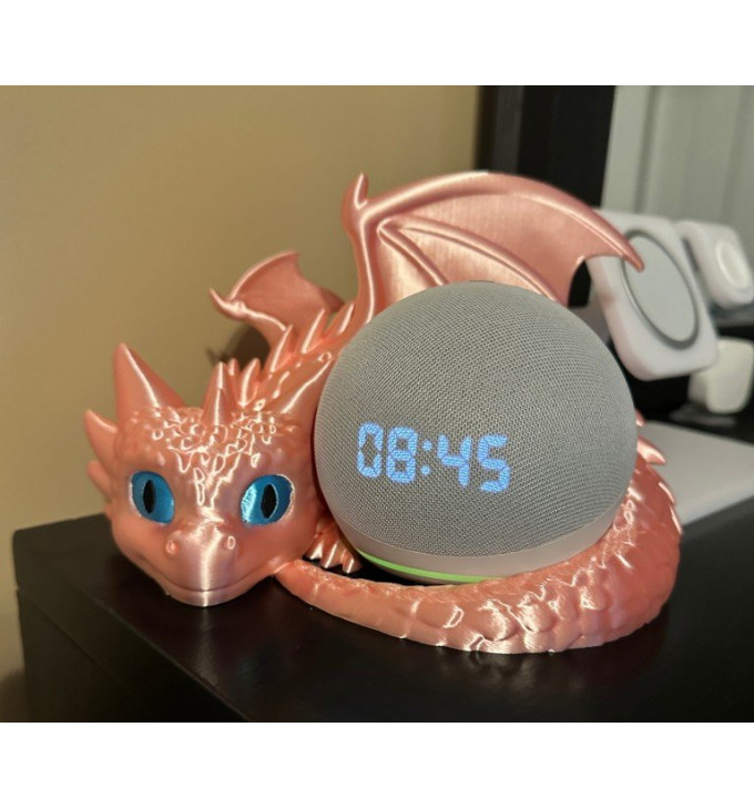 Aleksos Drakono Sargas“ – 3D spausdintas drakoniukas–stovelis, sukurtas Amazon Alexa įrenginiui. Drakonas susirangęs tarsi saugotų brangų „kiaušinį“ – į jo apskritą vietą patogiai įsitaiso Alexa kolonėlė, o pats stovas atrodo kaip stilinga dekoro detalė. Puikiai tinka ant darbo stalo, lentynos ar šalia lovos – tvarkinga, gražu ir išskirtina.