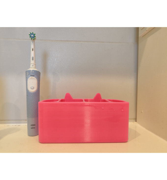 Šis kačiuko formos laikiklis – mielas ir praktiškas sprendimas tvarkingai voniai. Simetriškas skyrių išdėstymas padeda laikyti šepetėlius atskirai, kad jie nesiliestų tarpusavyje, o dantų pasta patogiai telpa per vidurį – taip laikiklis tampa stabilesnis ir mažiau linkęs apsiversti.