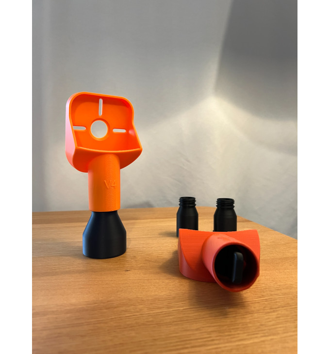 Šis komplektas išsiskiria universalumu – jį galima naudoti keliais būdais, priklausomai nuo situacijos. Prijungus dulkių siurblį, dulkės surenkamos tiesiai darbo metu, o naudojant butelį padidinamas surinkimo tūris. Jei tuo metu nereikia nei siurblio, nei butelio, anga gali būti uždengiama dangteliu. Dėl tokio sprendimo gaminys ypač patogus atliekant įvairius gręžimo darbus, kai norisi daugiau tvarkos, mažiau valymo ir patogesnio darbo proceso.