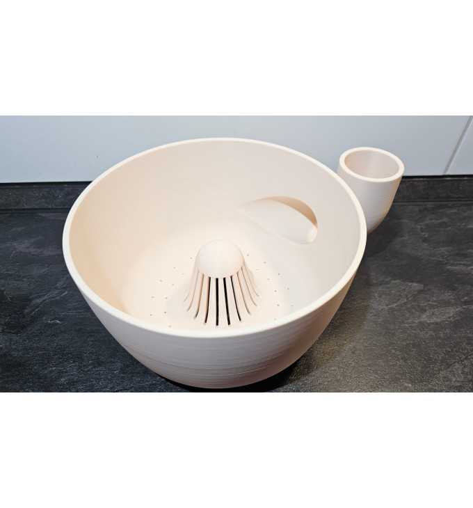 „HydroSūkurys“ – išmanus 3D spausdintas dubuo, kuris padeda greitai ir patogiai nuplauti vaisius bei daržoves. Šoninis vandens įtekėjimas sukuria stiprų sūkurio (vortex) efektą – vanduo švelniai suka produktus, todėl jie nusiplauna tolygiai ir kruopščiai, be intensyvaus trynimo. Puikus pasirinkimas kasdieniam naudojimui virtuvėje, kai norisi švaros greitai ir patogiai.