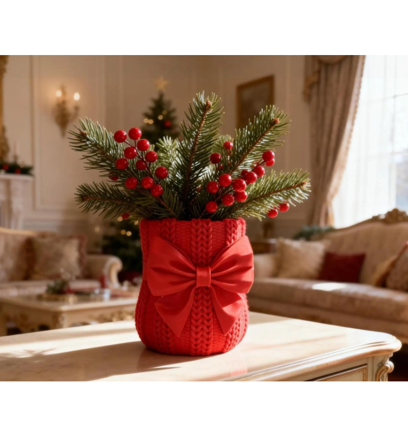 Šis vazonas su „megztinio“ rašto tekstūra ir dideliu kaspinu – jauki, šventiška interjero detalė, kuri atrodo tarsi supakuota dovana. Jis puikiai tinka tiek gėlėms (pvz., rožėms), tiek sezoninėms kompozicijoms – ypač žiemą su eglės šakelėmis, uogomis ar kankorėžiais.