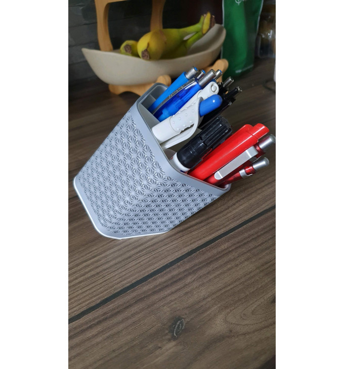 Tvarkingas ir stilingas Kumiko stiliaus rašiklių laikiklis – praktiškas sprendimas darbo stalui, namų biurui ar kūrybinei erdvei. Šis organizeris išsiskiria dekoratyviu raštu, modernia forma ir pasvirusiu dizainu, todėl rašiklius, pieštukus, žirkles, liniuotę ar kitus smulkius daiktus pasiekti tampa dar patogiau. Dėl 9 atskirų skyrių daiktai gali būti išdėstomi tvarkingai ir aiškiai, o pats laikiklis tampa ne tik naudingu, bet ir estetišku darbo vietos akcentu.