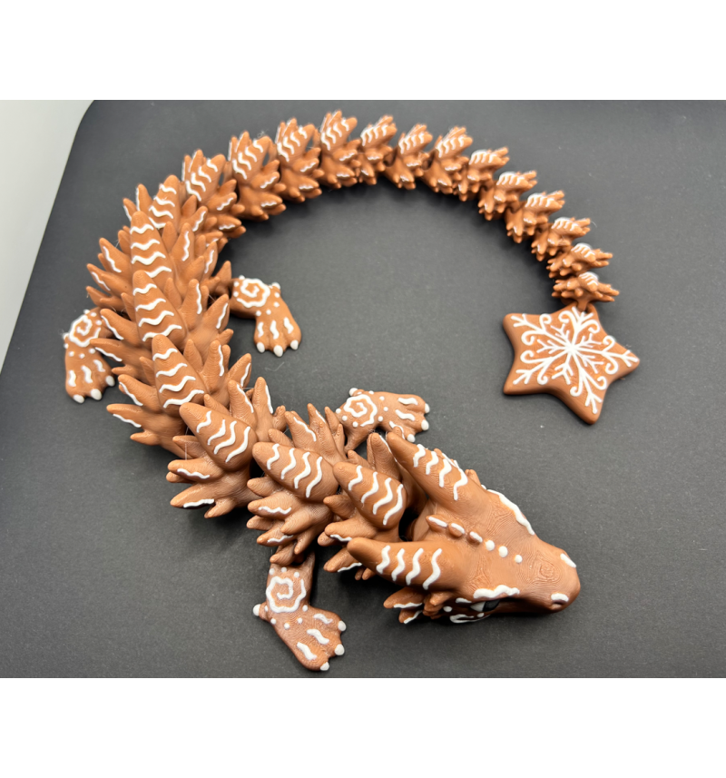 „Meduolio Snaigės Drakonas“ – didelis, šventiškas 3D spausdintas drakonas, atrodantis lyg ką tik ištrauktas iš kalėdinės kepyklos: meduolio spalvos korpusas, „glajaus“ raštai ir dekoratyvinė snaigė uodegos gale. Puikiai tinka žiemos namų dekorui, vitrinai, dovanai ar kolekcijai – tai iš karto patraukiantis akį, didelis akcentas.