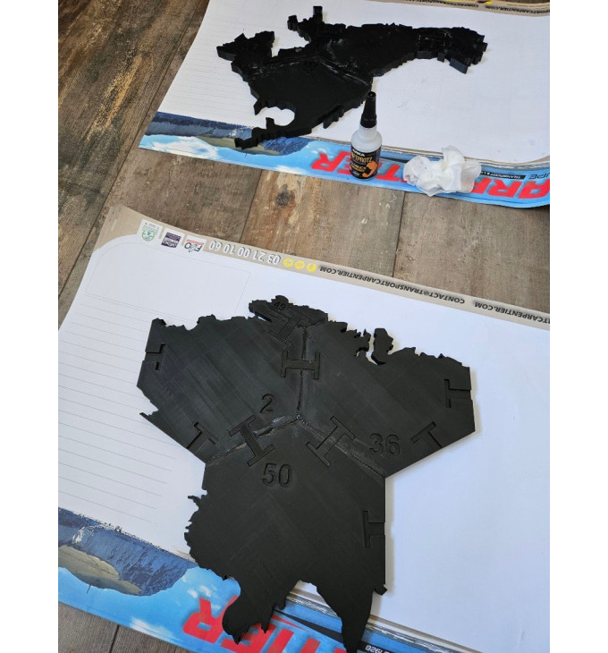 Žemėlapis tvirtinamas tvirta dvipuse lipnia juosta (pvz., Tesa ar 3M) – laikosi patikimai, o prireikus gali būti montuojamas ir ant vinių (prilaikant). Segmentai sunumeruoti, todėl surinkimas paprastesnis, o papildomi sujungimo „konektoriai“ suklijuojami cianoakrilato klijais (super klijais).