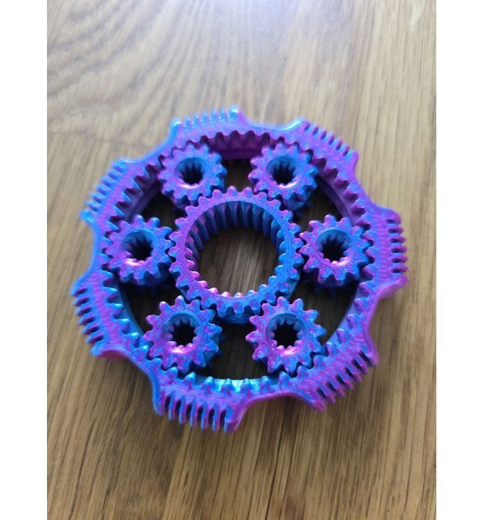Šis planetarinis pavarų fidget spinneris – mano versija klasikinio sukučio, kurią patogiau laikyti, nes jį galima užsimauti ant vieno piršto. Sukdamas jis maloniai „gyvena“: pavaros juda kartu, todėl žaislas ne tik ramina, bet ir vizualiai užburia – ypač kai spalvos kontrastuoja tarpusavyje.