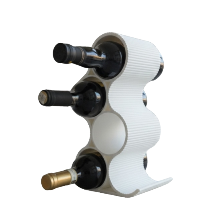 Ši moderni vyno butelių lentyna su briaunuota tekstūra ir organiška „bangos“ forma sukurta taip, kad būtų ir praktiška, ir dekoratyvi. Ji tvarkingai laiko butelius horizontaliai, o pati forma tampa interjero akcentu – puikiai tinka virtuvei, svetainei, namų barui ar dovanai vyno mėgėjui.