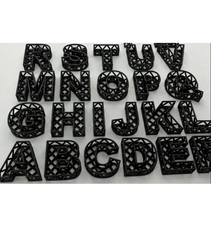 Dydis (apytiksliai, pagal vienos raidės pavyzdį): apie 7.9 × 7.2 × 2.2 cm (raidžių plotis gali šiek tiek skirtis). Svoris ir trukmė: viena raidė ~ 9,5 g , spausdinimas ~ 1 val. (gali kisti priklausomai nuo konkrečios raidės).
