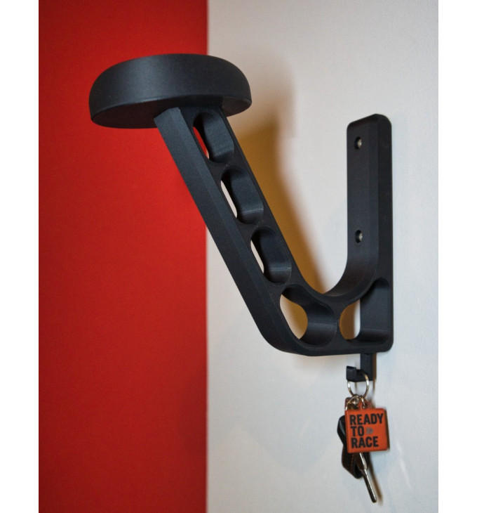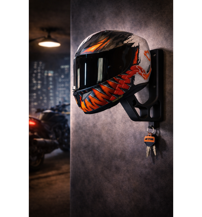 Puikiai tinka kasdieniam naudojimui: grįžai iš važiavimo – pakabinai šalmą ir viskas vienoje vietoje. Papildomas kabliukas patogus moto smulkmenoms: raktams, pirštinėms, kaklui/šalikui, lengvai striukei ar net kombinezono detalėms. Tai praktiškas sprendimas garažui, prieškambariui ar dirbtuvėms – kai norisi, kad šalmas būtų ne ant grindų, ne ant veidrodžio ar spintos krašto, o tvarkingai ir saugiai laikomas.