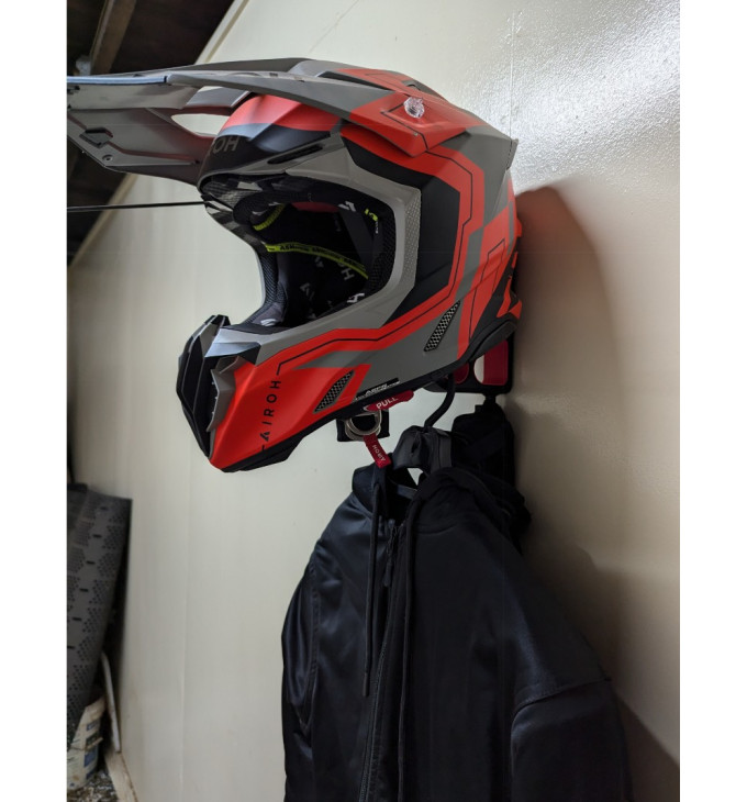 Puikiai tinka kasdieniam naudojimui: grįžai iš važiavimo – pakabinai šalmą ir viskas vienoje vietoje. Papildomas kabliukas patogus moto smulkmenoms: raktams, pirštinėms, kaklui/šalikui, lengvai striukei ar net kombinezono detalėms. Tai praktiškas sprendimas garažui, prieškambariui ar dirbtuvėms – kai norisi, kad šalmas būtų ne ant grindų, ne ant veidrodžio ar spintos krašto, o tvarkingai ir saugiai laikomas.