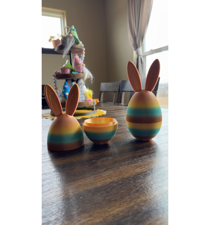 Šis velykinis kiaušinis su zuikio ausimis – ne tik dekoracija, bet ir praktiška dėžutė smulkioms staigmenoms. Viduje patogu laikyti saldainius, mažus šokoladinius kiaušinukus, žinutę ar mažą dovanėlę vaikams – puikus akcentas Velykų stalui, dovanų krepšeliui ar namų puošybai.