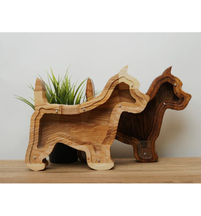 Tai yra medinė, šuns formos taupyklė, nudažyta rudos spalvos beicu. Monetos į taupyklę metamos pro viršuje esančią angą, o norint jas išimti, reikia atsukti stiklą. Taupyklė pagaminta iš natūralių ir ekologiškų medžiagų bei organinio stiklo, todėl yra saugi vaikams. Ši medinė taupyklė yra pagaminta iš 100% natūralių ir ekologiškų medžiagų. Mediena – tai tikras uosio blokas. Ant taupyklės dedamas skaidrus organinis stikliukas, leidžiantis matyti, kas yra viduje. Taupyklei prisipildžius, stikliuko išdaužti nereikės – užteks jį atsukti, išsiimti santaupas ir, prisukus atgal, vėl taupyti. Taupyklė gali būti naudojama ne tik kaip priemonė kaupti monetas, bet ir kaip puiki kambario dekoracija ar nuostabi ir unikali dovana šunų mylėtojui. Aukštos kokybės medžiagos ir daugkartinio naudojimo galimybė yra vieni iš šios taupyklės privalumų. Be to, yra galimybė užsakyti graviravimą, suteikiant taupyklei asmeniškumo. MEDŽIAGOS: - Uosio mediena - Organinis stiklas - Varžteliai IŠMATAVIMAI IR SVORIS: - 25,6 x 21,3 x 4 cm - 0,48 kg Priežiūra: - Skalbti 30°C (arba pagal etiketę) išvirkščiąja puse. - Naudoti švelnų skalbiklį; nenaudoti baliklių. - Džiovinti natūraliai; jei džiovyklėje – žema temperatūra (jei leidžia etiketė). - Lyginti žema–vidutine temperatūra. Kam tinka: vaikams, kaip dovana ir jaukiam namų akcentui. Privalumai: taupyklė padeda sukurti stilingą vaikų kambario interjerą, tinka krikštynoms ar gimtadieniui.| Specifikacija | |