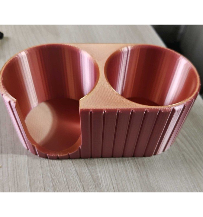 „Vonios Duetas“ – modernus, dviejų skyrių 3D spausdintas vonios organizatorius, skirtas vatos diskeliams (washing pads/cotton pads) ir ausų krapštukams (Q-tips) laikyti tvarkingai ir lengvai pasiekiamai. Minimalistinis, rievėtas dizainas gražiai atrodo ant praustuvo, lentynoje ar kosmetikos kampelyje – viskas matosi, niekas nesimėto.