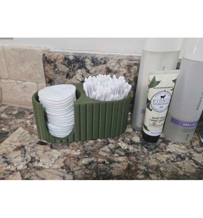 „Vonios Duetas“ – modernus, dviejų skyrių 3D spausdintas vonios organizatorius, skirtas vatos diskeliams (washing pads/cotton pads) ir ausų krapštukams (Q-tips) laikyti tvarkingai ir lengvai pasiekiamai. Minimalistinis, rievėtas dizainas gražiai atrodo ant praustuvo, lentynoje ar kosmetikos kampelyje – viskas matosi, niekas nesimėto.
